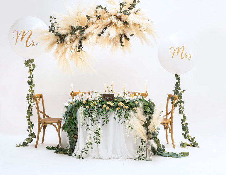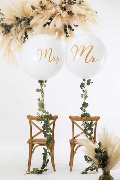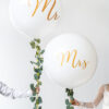 Balon o średnicy ok. 1 m, biały pastelowy ze złotym nadrukiem Mrs, wentyl umieszczony u dołu, do nadmuchania potrzeba 0,4 m3 helu.