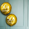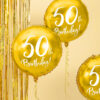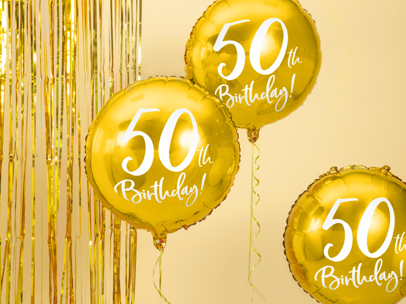 Balon foliowy metalizowany, okrągły w kolorze złotym z białym napisem 50th Birthday, średnica ok. 45 cm (18”).