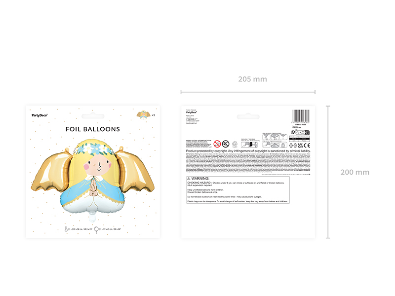 Balon foliowy Aniołek, mix kolorów, wymiary przed napompowaniem ok. 103 x 58 cm (40.5 x 23”), wymiary po napompowaniu ok. 77 x 45 cm (30 x 18”). Do napompowania powietrzem i helem. Zestaw zawiera słomkę.