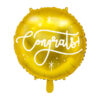 Błyszczący balon foliowy Congats! w kolorze złotym z białym nadrukiem, średnica przed napompowaniem ok. 45 cm (18”), średnica po napompowaniu ok. 35 cm (14”). Do napompowania powietrzem i helem.