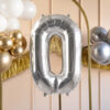 Balon foliowy metalizowany Cyfra 0 w kolorze srebrnym, rozmiar przed napompowaniem ok. 86 cm (34”), rozmiar po napompowaniu ok. 72 cm (28”). Do napompowania powietrzem i helem. Zestaw zawiera słomkę. Balon jest samouszczelniający się. Posiada haczyki ułatwiające montaż balona do dekoracji.
