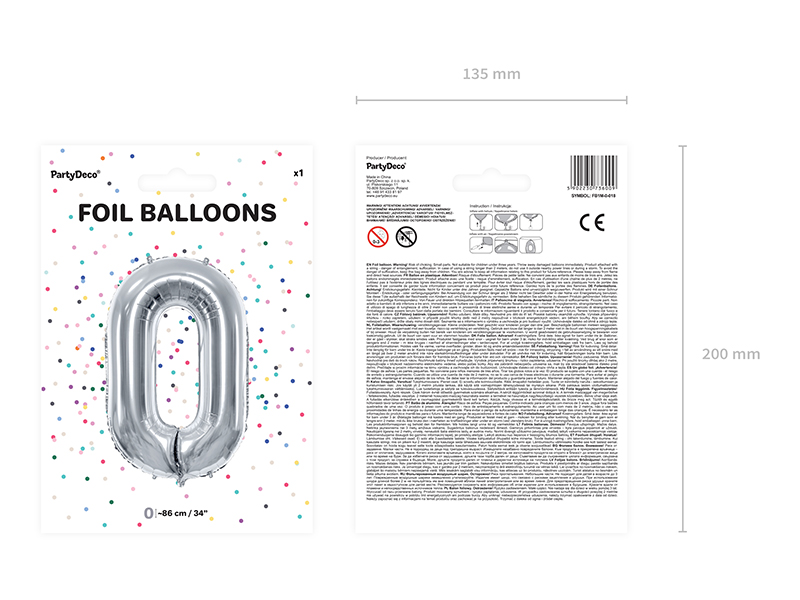 Balon foliowy metalizowany Cyfra 0 w kolorze srebrnym, rozmiar przed napompowaniem ok. 100 cm (39”), rozmiar po napompowaniu ok. 86 cm (34”). Do napompowania powietrzem i helem. Balon jest samouszczelniający się. Posiada haczyki ułatwiające montaż balona do dekoracji.
