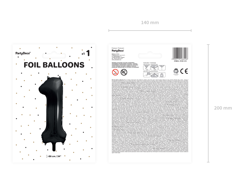 Balon foliowy pastelowy Cyfra 1 w kolorze czarnym, rozmiar przed napompowaniem ok. 100 cm (39”), rozmiar po napompowaniu ok. 86 cm (34”). Do napompowania powietrzem i helem. Balon jest samouszczelniający się. Posiada haczyki ułatwiające montaż balona do dekoracji.