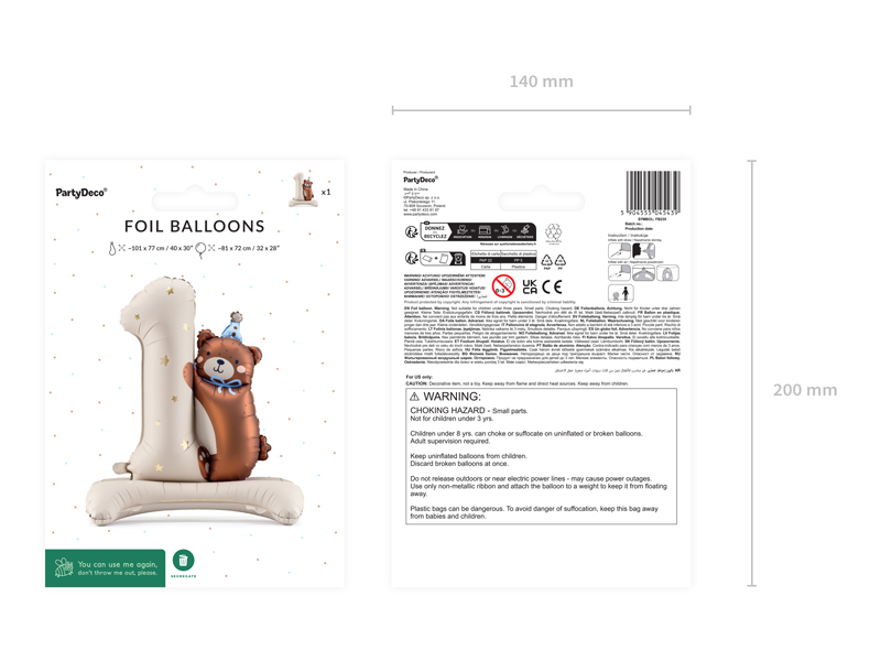 Balon foliowy w kształcie cyfry „1” z misiem, wym ok. 81 x 72 cm. Do napompowania powietrzem. Zestaw zawiera słomkę.