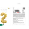 Balon foliowy metalizowany Cyfra 2 w kolorze jasnozłotym, rozmiar przed napompowaniem ok. 86 cm (34”), rozmiar po napompowaniu ok. 72 cm (28”). Do napompowania powietrzem i helem. Zestaw zawiera słomkę. Balon jest samouszczelniający się. Posiada haczyki ułatwiające montaż balona do dekoracji.