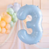 Balon foliowy pastelowy Cyfra 3 w kolorze jasnoniebieskim, rozmiar przed napompowaniem ok. 86 cm (34”), rozmiar po napompowaniu ok. 72 cm (28”). Do napompowania powietrzem i helem. Zestaw zawiera słomkę. Balon jest samouszczelniający się. Posiada haczyki ułatwiające montaż balona do dekoracji.