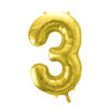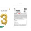 Balon foliowy metalizowany Cyfra 3 w kolorze jasnozłotym, rozmiar przed napompowaniem ok. 86 cm (34”), rozmiar po napompowaniu ok. 72 cm (28”). Do napompowania powietrzem i helem. Zestaw zawiera słomkę. Balon jest samouszczelniający się. Posiada haczyki ułatwiające montaż balona do dekoracji.