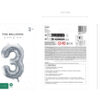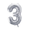 Balon foliowy metalizowany Cyfra 3 w kolorze srebrnym, rozmiar przed napompowaniem ok. 86 cm (34”), rozmiar po napompowaniu ok. 72 cm (28”). Do napompowania powietrzem i helem. Zestaw zawiera słomkę. Balon jest samouszczelniający się. Posiada haczyki ułatwiające montaż balona do dekoracji.