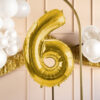 Balon foliowy metalizowany Cyfra 6 w kolorze jasnozłotym, rozmiar przed napompowaniem ok. 86 cm (34”), rozmiar po napompowaniu ok. 72 cm (28”). Do napompowania powietrzem i helem. Zestaw zawiera słomkę. Balon jest samouszczelniający się. Posiada haczyki ułatwiające montaż balona do dekoracji.