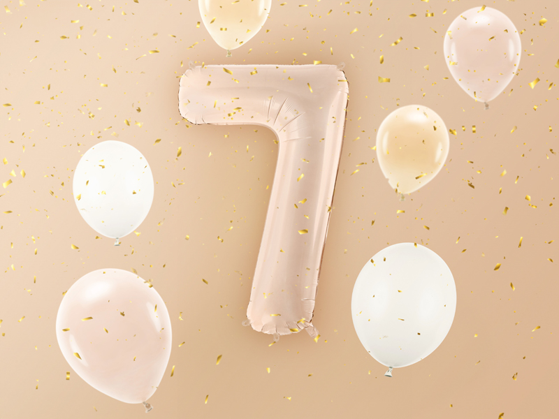 Balon foliowy matowy Cyfra 7 w kolorze ciemnobeżowym, rozmiar przed napompowaniem ok. 86 cm (34”), rozmiar po napompowaniu ok. 72 cm (28”). Do napompowania powietrzem i helem. Zestaw zawiera słomkę. Balon jest samouszczelniający się. Posiada haczyki ułatwiające montaż balona do dekoracji.