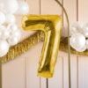Balon foliowy metalizowany Cyfra 7 w kolorze jasnozłotym, rozmiar przed napompowaniem ok. 86 cm (34”), rozmiar po napompowaniu ok. 72 cm (28”). Do napompowania powietrzem i helem. Zestaw zawiera słomkę. Balon jest samouszczelniający się. Posiada haczyki ułatwiające montaż balona do dekoracji.