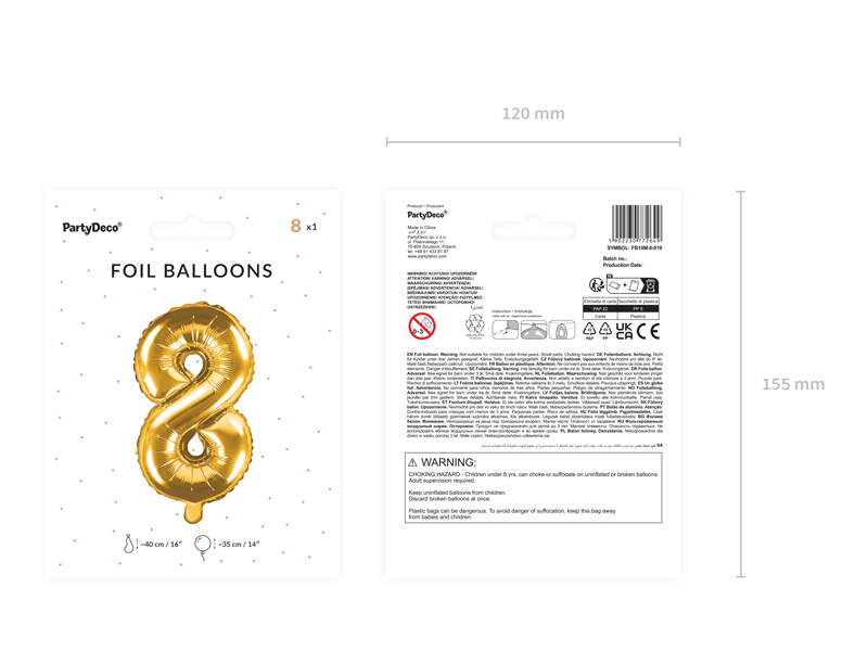 Balon foliowy metalizowany Cyfra ”8” w kolorze złotym, rozmiar przed napompowaniem ok. 40 cm (16”), rozmiar po napompowaniu ok. 35 cm (14”). Do napompowania powietrzem.