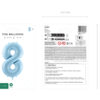 Balon foliowy pastelowy Cyfra 8 w kolorze jasnoniebieskim, rozmiar przed napompowaniem ok. 86 cm (34”), rozmiar po napompowaniu ok. 72 cm (28”). Do napompowania powietrzem i helem. Zestaw zawiera słomkę. Balon jest samouszczelniający się. Posiada haczyki ułatwiające montaż balona do dekoracji.