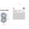 Balon foliowy metalizowany Cyfra 8 w kolorze srebrnym, rozmiar przed napompowaniem ok. 100 cm (39”), rozmiar po napompowaniu ok. 86 cm (34”). Do napompowania powietrzem i helem. Balon jest samouszczelniający się. Posiada haczyki ułatwiające montaż balona do dekoracji.