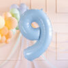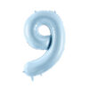 Balon foliowy pastelowy Cyfra 9 w kolorze jasnoniebieskim, rozmiar przed napompowaniem ok. 86 cm (34”), rozmiar po napompowaniu ok. 72 cm (28”). Do napompowania powietrzem i helem. Zestaw zawiera słomkę. Balon jest samouszczelniający się. Posiada haczyki ułatwiające montaż balona do dekoracji.