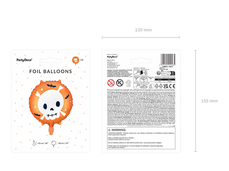 Okrągły balon foliowy Czaszka, mix kolorów, wymiary przed napompowaniem ok. 45 cm (18”), wymiary po napompowaniu ok. 35 cm (14”). Do napompowania powietrzem i helem. Zestaw zawiera słomkę.