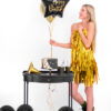 Błyszczący balon foliowy w kształcie gwiazdki w kolorze czarnym ze złotym metalizowanym napisem Happy Birthday, rozmiar przed napompowaniem ok. 47 cm (18.5”), rozmiar po napompowaniu ok. 40 cm (15.5”). Do napompowania powietrzem i helem.