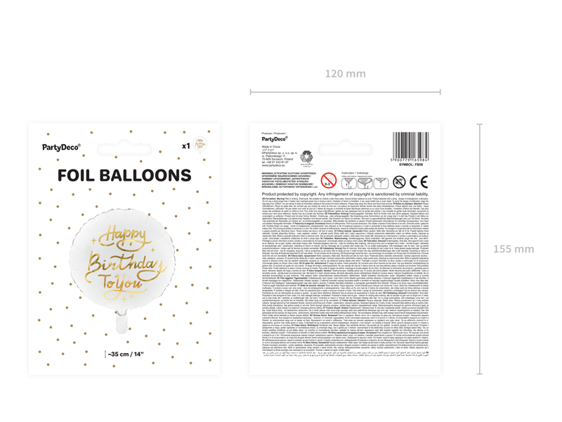 Matowy balon foliowy w kolorze białym ze zlotym metalizowanym napisem Happy Birthday To You, średnica przed napompowaniem ok. 45 cm (18”), średnica po napompowaniu ok. 35 cm (14”). Do napompowania helem.