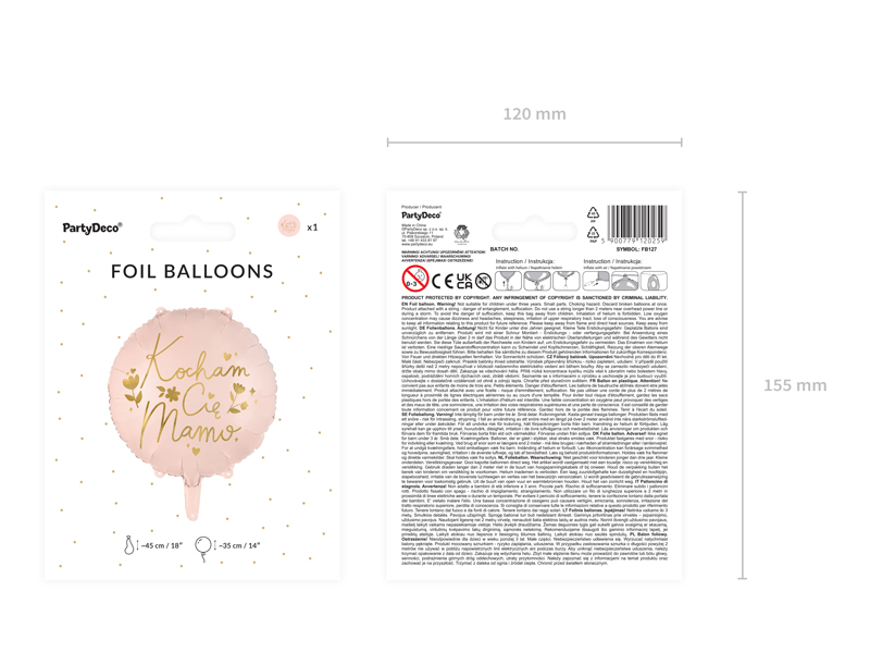 Balon foliowy okrągły w kolorze różowym ze złotym napisem „Kocham Cię Mamo”, wymiary: wysokość przed napompowaniem ok. 45 cm (18”), wymiary po napompowaniu ok. 35 cm (14”). Do napompowania powietrzem i helem.