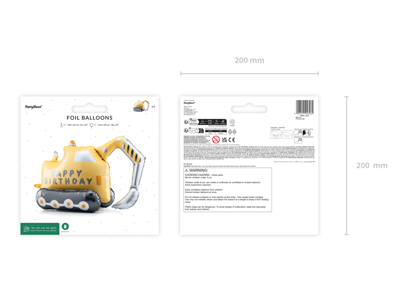 Stojący balon foliowy Koparka, mix kolorów. Wymiary przed napompowaniem ok. 59×105 cm, wymiary po napompowaniu ok. 49×76,5 cm. Do napompowania powietrzem. Zestaw zawiera słomkę.