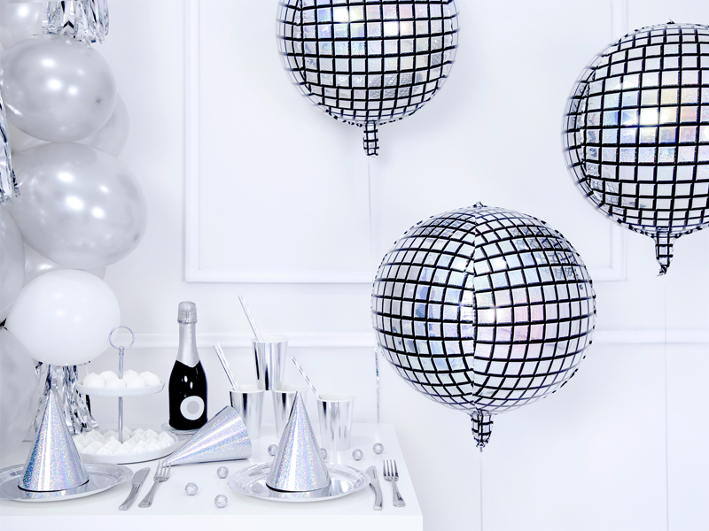Balon foliowy Kula dyskotekowa wykonany z holograficznej folii, rozmiar przed napompowaniem ok. 50 cm (20”), rozmiar po napompowaniu ok. 40 cm (16”). Do napompowania helem.