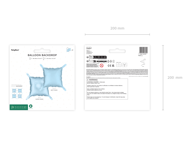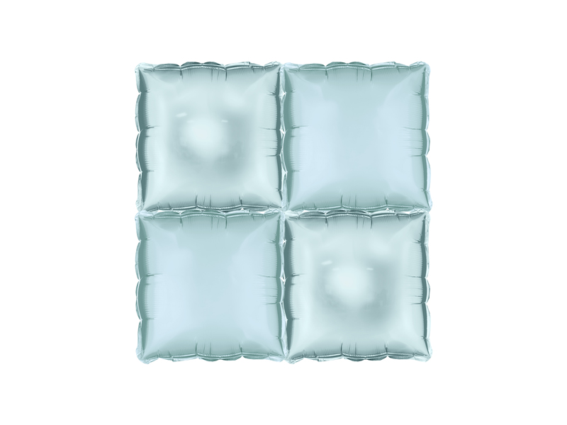 Tło foliowe balonowe Kwadrat dwustronne jasnoniebieskie, z jednej strony matowe wykończenie, z drugiej błyszczące. Zestaw zawiera 4 balony kwadraty. Wymiary przed napompowaniem ok. 40 x 40 cm, wymiary po napompowaniu 35 x 35 cm. Do napompowania powietrzem. Zestaw zawiera słomkę. Instrukcja montażu na grafice pod zdjęciem. Wszystkie balony foliowe kurtyny Kwadraty dostępne w ofercie są w takim samym rozmiarze dzięki czemu możliwe jest dowolne łączenie kwadratów ze sobą. (1 op. / 4 szt.)