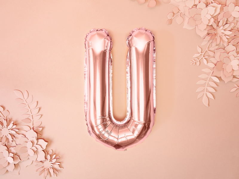 Balon foliowy metalizowany Litera ”U” w kolorze różowego złota, wysokość przed napompowaniem ok. 40 cm (16”), wysokość po napompowaniu ok. 35 cm (14”). Do napompowania powietrzem.