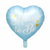 Błyszczący balon foliowy w kształcie serca w kolorze niebieskim ze złotym metalizowanym napisem Mom to Be, średnica przed napompowaniem ok. 45 cm (18”), średnica po napompowaniu ok. 35 cm (14”). Do napompowania helem.