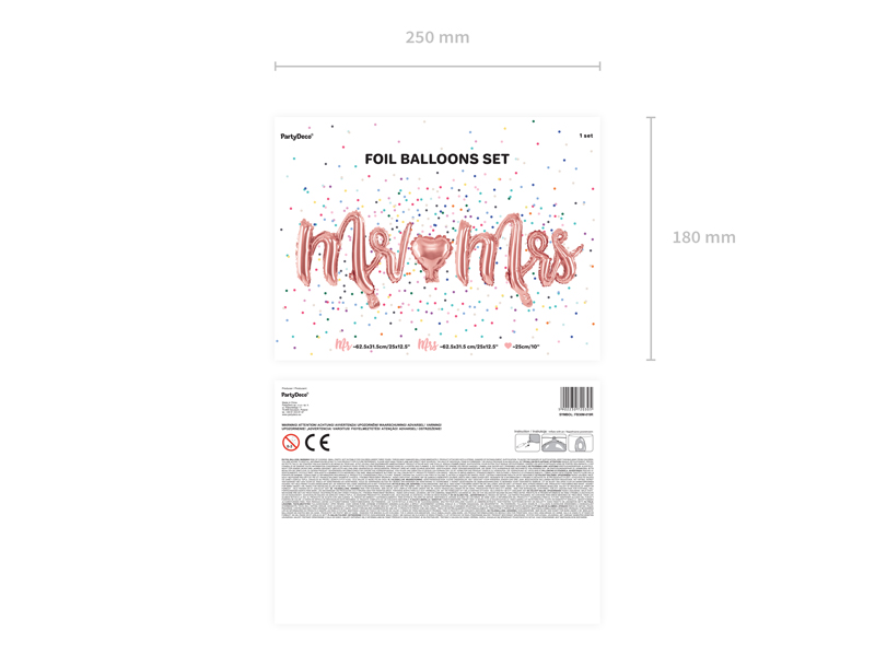 Balon foliowy metalizowany Mr Mrs w kolorze różowego złota, zestaw zawiera balon foliowy Mr – wymiary ok. 62,5 x 31,5 cm (25 x 12.5”), balon foliowy Mrs – wymiary ok. 69 x 32.5 cm (27 x 13”) oraz balon foliowy serce – średnica ok. 25 cm (10”).