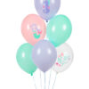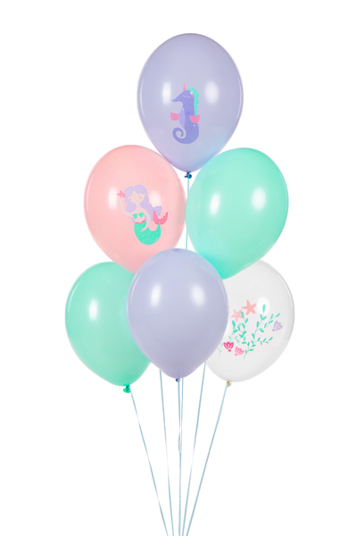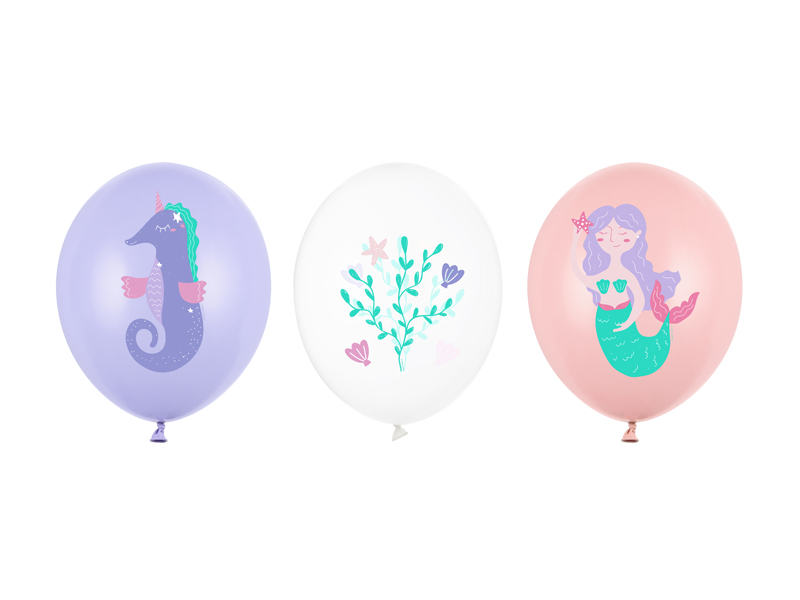 Balony Strong Morski Świat z nadrukami, zestaw zawiera 3 wzory: Crystal Clear z kolorowym nadrukiem, pastelowy w kolorze Pale Pink z kolorowym nadrukiem i pastelowy w kolorze Light Lilac z kolorowym nadrukiem, średnica ok. 30 cm. (1 op. / 50 szt.)