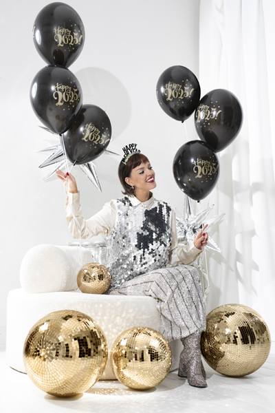 Balony Strong w kolorze Pastel Black ze złotym dwustronnym nadrukiem Happy 2025!, średnica ok. 30 cm (1 op. / 6 szt.)