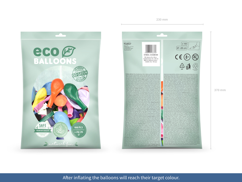 Balony Eco metalizowane, mix kolorów: biały, żółty, czerwony, zielona trawa, jasny niebieski, niebieski, różowy, pomarańczowy, złoty, srebrny, średnica ok. 26 cm. (1 op. / 100 szt.)