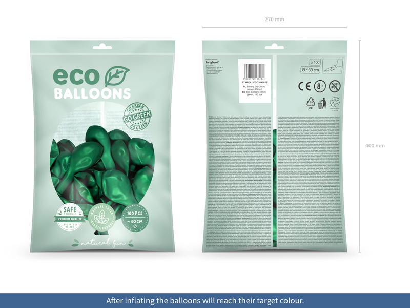 Balony Eco metalizowane w kolorze zielonym, średnica ok. 30 cm. (1 op. / 100 szt.)
