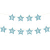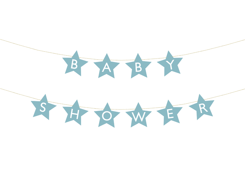 Baner w kształcie gwiazdek z napisem Baby Shower wykonany z papieru w kolorze jasnoniebieskim, wymiary sznurka ok. 3m.