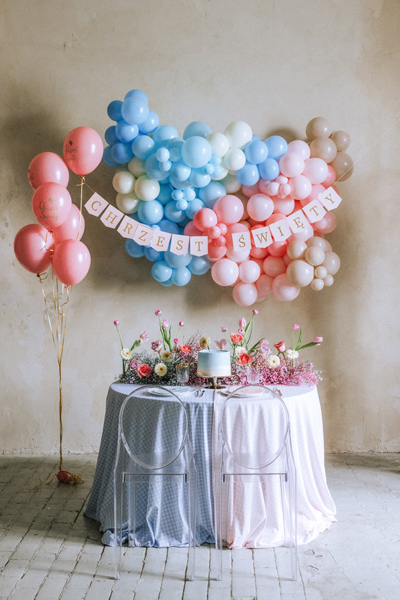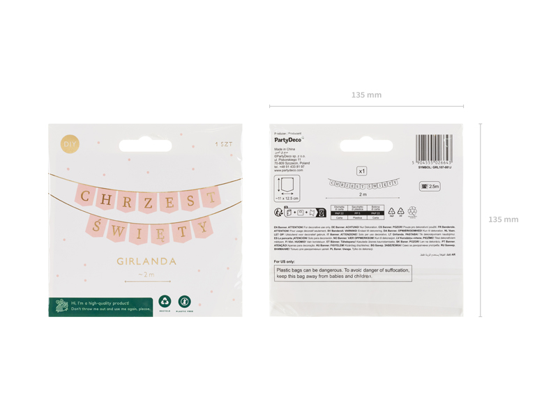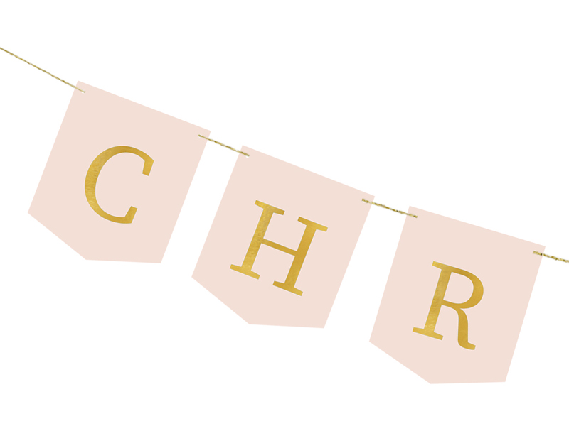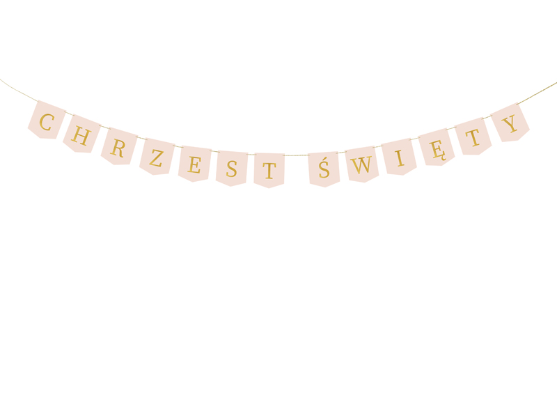 Baner ”Chrzest Święty” wykonany z papieru w kolorze jasnoróżowym ze złotym napisem oraz sznurek w kolorze złotym o długości ok. 2.5 m. Produkt do samodzielnego złożenia.