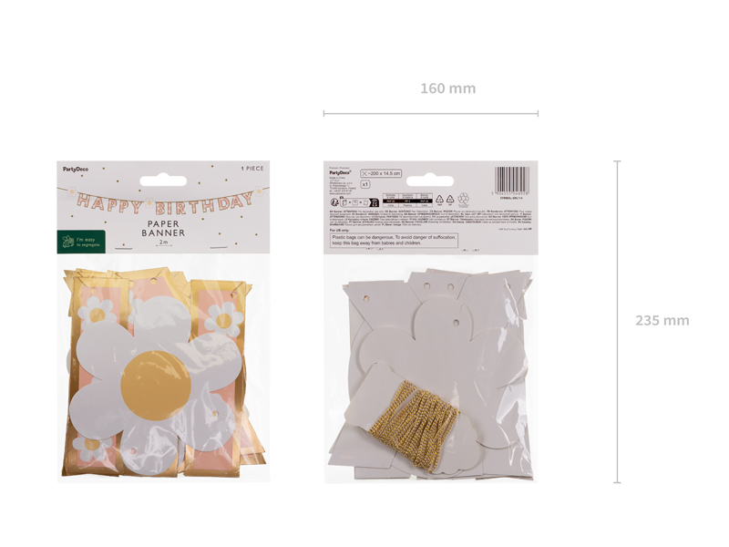 Baner papierowy Happy Birthday, mix kolorów. Wysokość ok. 14.5 cm, długość sznurka ok. 3.5 m. Produkt do samodzielnego złożenia.