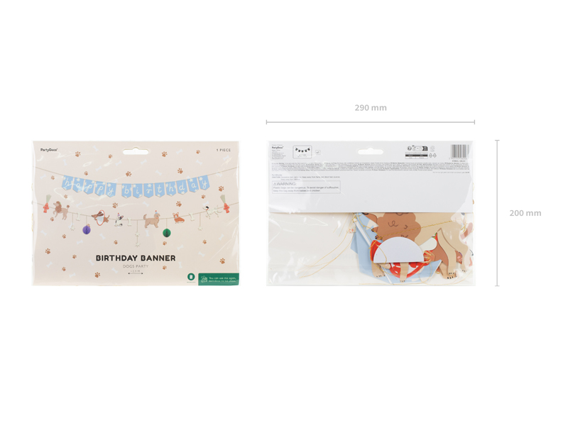 Baner Happy Birthday Pieski, mix kolorów, długość 210 cm. Produkt gotowy do użycia po wyjęciu z opakowania. Zestaw składa się z 2 osobnych banerów: napis Happy Birthday oraz mix piesków i wzorów oba przeszyte złotym sznurkiem.