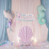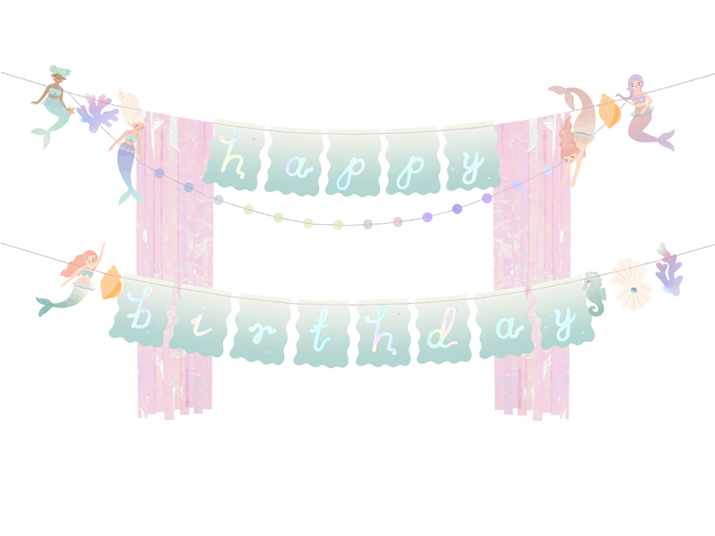 Baner Happy Birthday Syrenka wykonany z papieru, mix kolorów, wymiary ok. 130 x 100 cm, długość sznurka ok. 4.3 m. Produkt do samodzielnego złożenia.