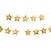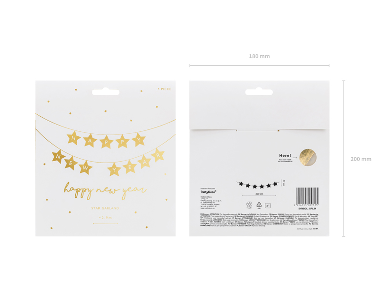 Baner Happy New Year w kształcie gwiazdek, wykonany z papieru lustrzanego w kolorze złotym, wymiary ok. 290×17 cm, długość sznurka ok. 4 m.