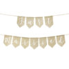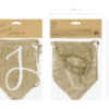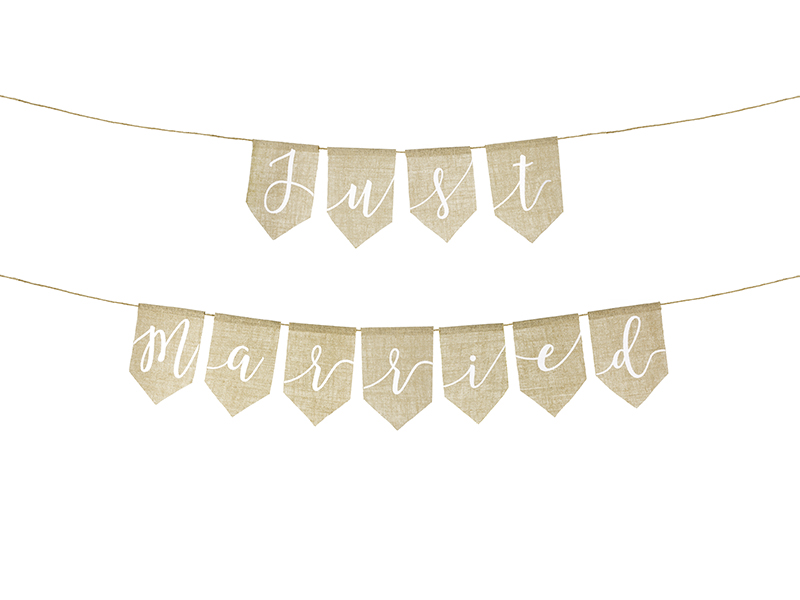 Baner wykonany z juty z białym napisem Just married, baner składa się z dwóch części o wymiarach: Just – wysokość ok. 23 cm, długość ok. 65 cm, married – wysokość ok. 23 cm, długość ok. 120 cm.