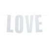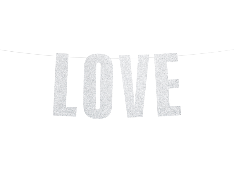Baner Love w kolorze srebrnym brokatowym, do samodzielnego złożenia, zestaw zawiera literki oraz ok. 2 m białego sznurka, wymiary po złożeniu: wysokość ok. 21 cm, długość ok. 55 cm.