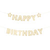 Baner papierowy Happy Birthday w kolorze biało-złotym. Wysokość ok. 14.5 cm, długość sznurka ok. 3 m. Produkt do samodzielnego złożenia.