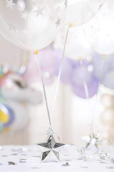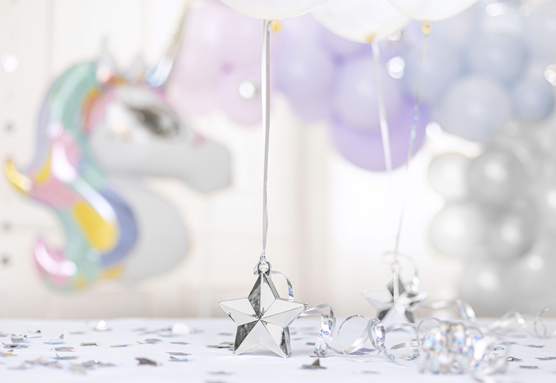 Ciężarek do balonów w kształcie gwiazdki, wykonany z plastiku w kolorze srebrnym, wymiary ok. 10 x 11 cm, waga ok. 175 g.