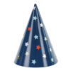 Czapeczki wykonane z papieru w kolorze granatowym z kolorowym nadrukiem gwiazdek, wysokość ok. 16 cm, średnica ok. 11 cm. (1 op. / 6 szt.)