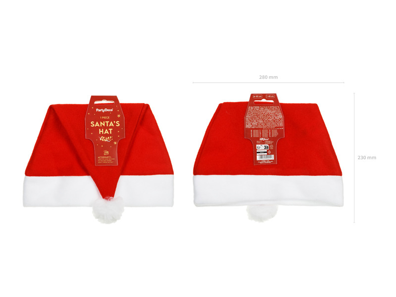 Czapka Świętego Mikołaja, w kolorze czerwono-białym, długość ok. 40 cm, średnica otworu na głowę ok. 60 cm.