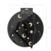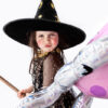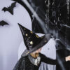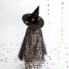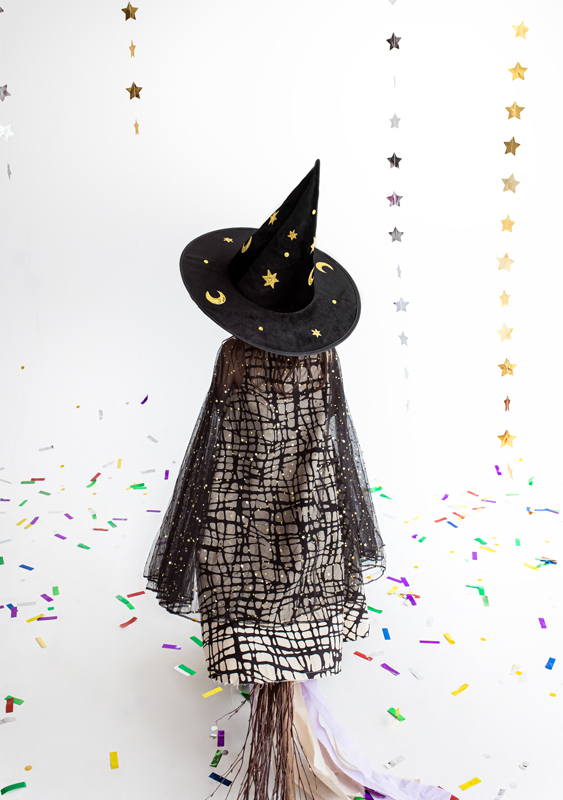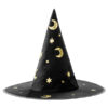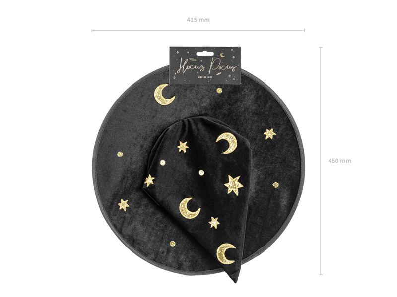 Kapelusz wiedźmy w kolorze czarnym, średnica otworu na głowę 19 cm, średnica ronda 42 cm, wysokość 32 cm.