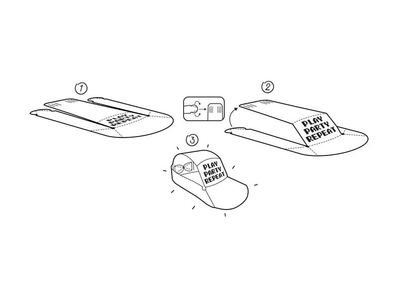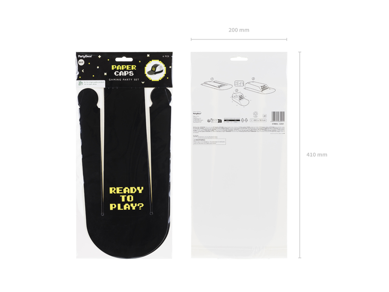 Czapki papierowe Gamer w kolorze czarnym z nadrukiem w kolorze neonowo żółtym, wymiary ok. 38.5 x 18.5 cm. (1 op. / 6 szt.)
