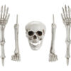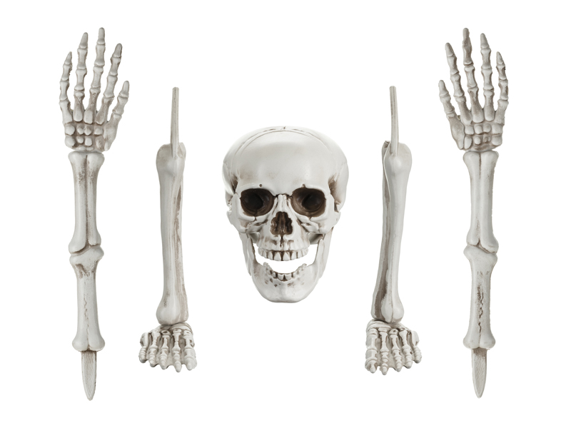 Dekoracja Szkielet składająca się z 5 pojedynczych elementów – czaszki, rąk i nóg, przeznaczona do użytku wewnętrznego i zewnętrznego. Skład: PP – 99%, żelazo – 1%.