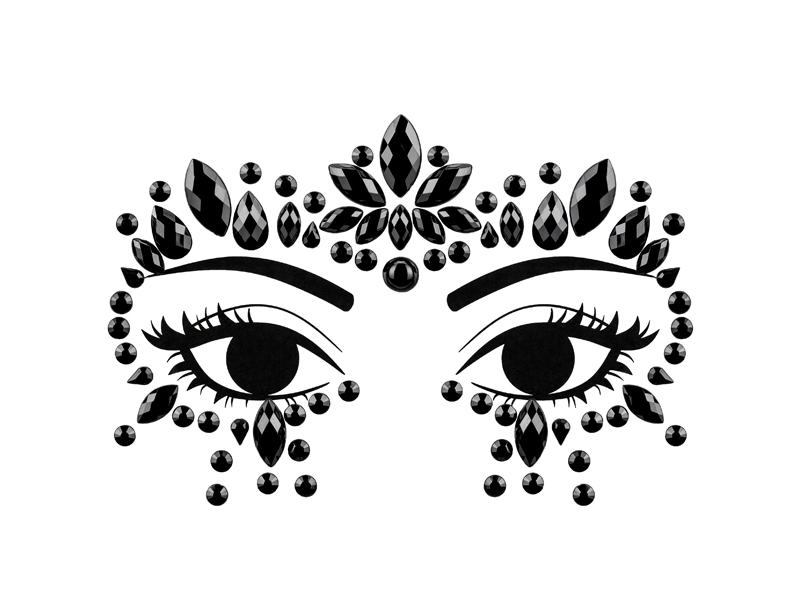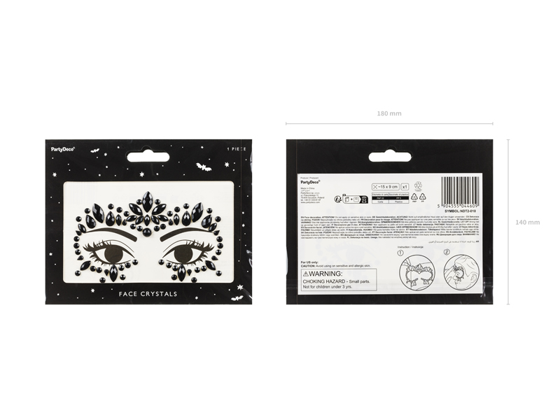 Samoprzylene kryształki do dekoracji twarzy, czarne, rozmiar zestawu ok. 15×9 cm. Produkt jednorazowego użytku. Kryształki łatwo przykleić do skóry twarzy dzięki samoprzylepnej warstwie. Nie nakładać na wrażliwą skórę lub oczy. Skład: akryl – 98%, PVC – 2%.