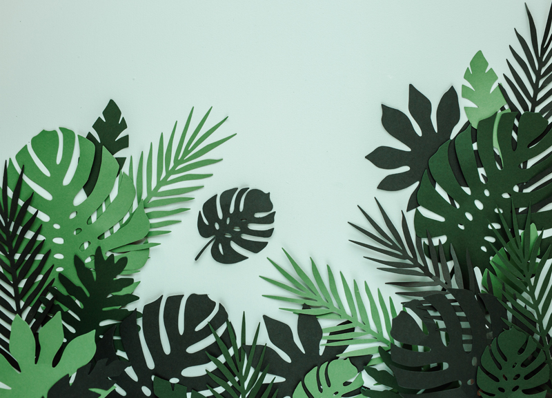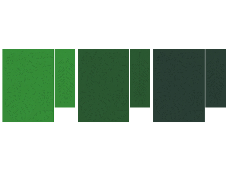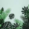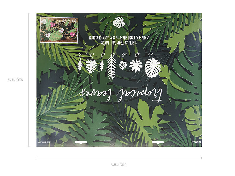 Dekoracje papierowe Aloha – Liście tropikalne, mix, zestaw zawiera 7 różnych kształtów liści, każdy kształt w trzech odcieniach koloru zielonego. (1 op. / 21 szt.)